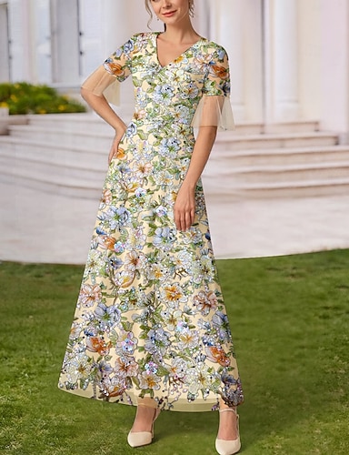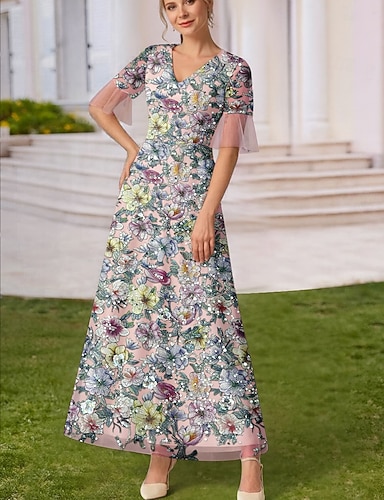 A-Line lunghezza intera abito con paillettes abito per prom abito da festa abito madre della sposa manica corta collo a V elegante vintage festa con paillettes