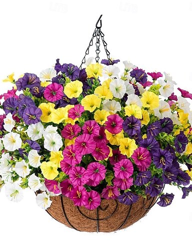 Fiori artificiali da esterno con vasi sospesi, petunie finte resistenti ai raggi UV con fioriera sospesa per la decorazione primaverile di porte e verande.