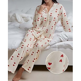 pigiama da donna per San Valentino, casual, comodo, per la casa, quotidiano, caldo, con scollo a V, manica lunga, cardigan, pantaloni, abbottonatura, elastico in vita, autunno inverno, abiti per la