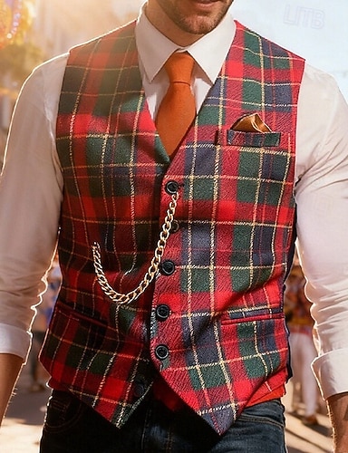 Per uomo Gilet All'aperto Carnevale Formale Moda Streetwear Primavera Autunno Bottoni Poliestere Traspirabilità Plaid Monopetto Scollo a V Vestibilità su misura Rosso Gilet