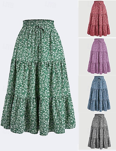 Per donna Elegante Moda Casual Maxi Vita media Gonne Floreale Arricciato Coulisse Micro-elastico Streetwear Uscire Blu Nero Giallo Rosso Estate Poliestere