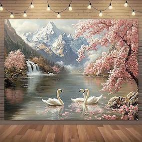 Lago del Cigno Bianco, paesaggio naturale, montagna innevata, fiori di ciliegio, fiori rosa, cascata, scenario sereno, arazzo da parete, grande sfondo per camera da letto, soggiorno, decorazione per