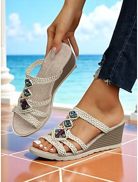 sandali da donna con zeppa intrecciata e perline multicolori – scarpe da spiaggia e resort boho chic per le vacanze o per il comfort quotidiano