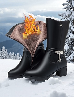 stivali invernali neri da donna con fodera in lana per il calore, cerniera elegante e dettaglio con ciondolo, tacco spesso, perfetti per il freddo, Natale e uscite informali