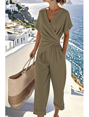 Per donna Set di Pantaloni Bolero Top Manica Corta Scollo a V Semplice Arricciato Elegante Moda Streetwear Casuale Quotidiano All'aperto Blu Cachi Beige Estate Vestibilità regolare