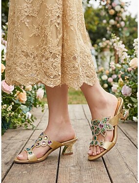 sandali con tacco e pietre preziose dorate da donna: eleganti scarpe da mamma per matrimoni in giardino