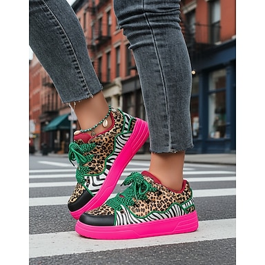 sneakers da donna con stampa leopardata al neon - sneakers con plateau color-block audaci e strisce zebrate - scarpe streetwear artistiche uniche per i festival urbani