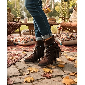 stivali scamosciati con frange in stile western retrò da donna - stivali con tacco marrone a metà polpaccio per outfit casual e boho