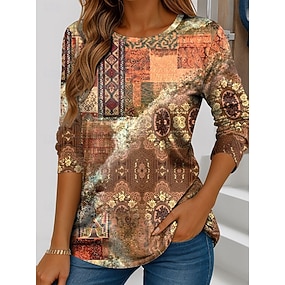 Per donna Maglietta Stampato Grafico Tribale Vintage Elegante Casual Manica Lunga Girocollo Top lunghi Quotidiano Blu Azzurro cielo Arancione Marrone Cachi Primavera Autunno
