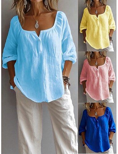Per donna Camicia Blusa Finto cotone e lino Arricciato Tinta unica Quotidiano Elegante Casual Manica Lunga Collo quadrato Top Regolari Quotidiano Blu Giallo Rosa Azzurro cielo Estate Primavera Autunno