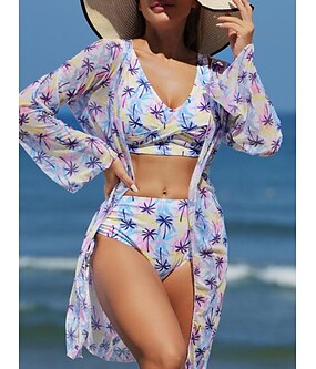 Costume da bagno bikini tre pezzi da donna Palma Cheeky Slim Senza schienale Abbigliamento da spiaggia in vacanza Floreale Collo a V Senza maniche