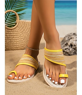 sandali bassi scintillanti con strass da donna, cinturini incrociati con anelli per le dita dei piedi, eleganti calzature antiscivolo per eleganti vacanze al mare.