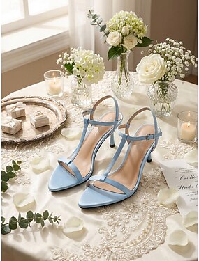 sandali con tacco e cinturino a T azzurro chiaro da donna, eleganti scarpe da damigella in raso per matrimoni all'aperto in giardino
