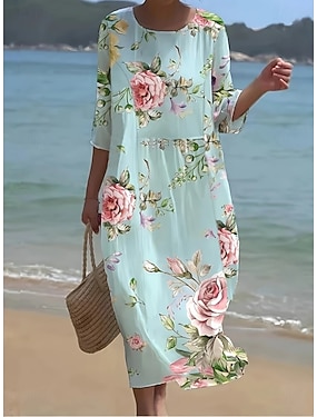 Vestito maxi da donna in lino simile traspirante leggero abito da sole abito a linea abito estivo vacanza casual boho quotidiano spiaggia vacanza maniche 3/4 scollo a giro