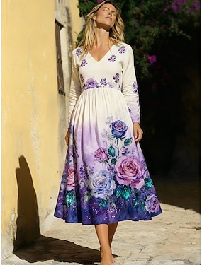 Per donna Abito Midi Abito Boho Vestito Casual Elegante Moda Quotidiano All'aperto Vacanza Vestibilità regolare Floreale Manica Lunga Scollo a V Viola Estate Primavera Autunno