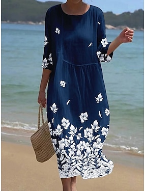 Per donna Abito Midi Finto cotone e lino Abito a trapezio Casual Quotidiano Vestibilità comoda Floreale Manica 3/4 Scollo a V Blu Bianco Arancione Estate