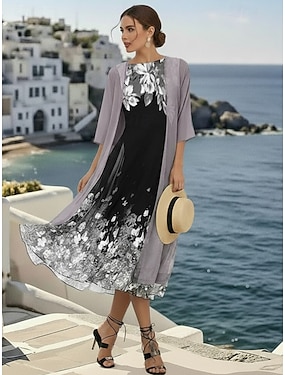 Per donna Insieme del vestito Vestito in Chiffon Formale Floreale Stampato Abito maxi Mezza Manica Girocollo Feste Viola Grigio Estate Vestibilità comoda