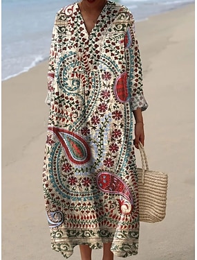 Abito Midi da Donna V Collo Maniche Lunghe Kaftan Leggero Comodo A Line Abito Casual Boho Uscita Grafica Maniche Lunghe V Collo Giallo Rosso Off-white Khaki
