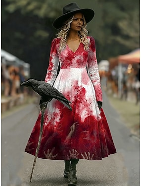 Abito Midi da Donna Stampa Strega Abito A-Line Vacanze Casual Quotidiano Regolare Vestibilità Grafica Floreale Hocus Pocus Maniche Lunghe Collo a V Nero Rosso Marrone Primavera Autunno