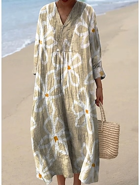 Abito maxi in cotone e lino da donna Abito a linea Abito casual Quotidiano Vestibilità ampia Panna Maniche lunghe V collo Nero Bianco Giallo Verde militare Estate Primavera Autunno
