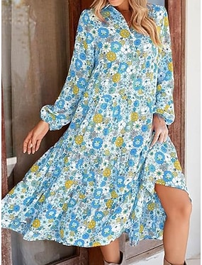 Per donna Vestito longuette Abito casual Vestito svasato Abito linea A Informale Giornaliero Standard Floreale Manica lunga Collo diviso Azzurro cielo Verde Cachi Estate Primavera Autunno