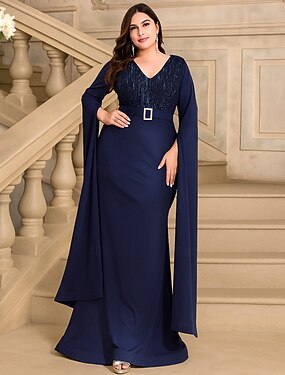 Abito da Ospite di Nozze Sheath Colonna di Lunghezza Piena Abiti Formali Abito da Sera Abito per Madre della Sposa Manica Lunga Collo a V Elegante Vintage Taglia Plus Spandex con Paillette