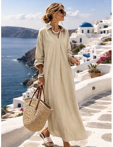 Per donna Abito Lungo Maxi Abito Finto cotone e lino Abito a Tubino Abito Camicia Abito Estivo Elegante Casual Quotidiano Vacanza Data Vestibilità regolare Semplice Manica Lunga Bavero Nero Vino