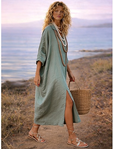 Per donna Abito Midi Finto cotone e lino Vestito a caftano Moderno Quotidiano All'aperto Vacanza Vestibilità comoda Semplice Manica Lunga Colletto a Camicia Verde Estate Primavera