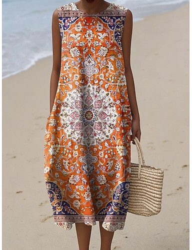 Abito Midi da Donna in Lino Abito da Sole Vacanza Casuale Uscita Fit Normale Grafico Geometrico Senza Maniche Collo Giro Blu Rosso Arancione Verde Estate Primavera