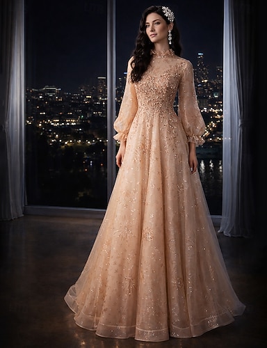 Linea ad A Lunghezza al pavimento Abiti da Ballo Elegante Scintillante Manica Lunga Collo Alto Ospite di nozze Fidanzamento Tulle con Paillettes