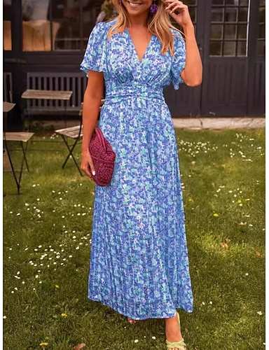 Per donna Abito Lungo Maxi Abito Abito a trapezio Abito Floreale Elegante Moda Moderno Quotidiano All'aperto Vacanza Vestibilità regolare Floreale Manica Corta Scollo a V Blu Nero Marrone Estate