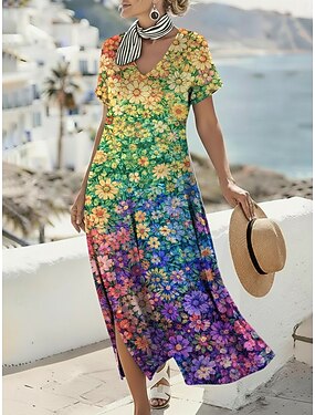 Per donna Vestito maxi Abito casual Abito linea A Abito boho Boemia Vintage Informale Da mare Giornaliero Standard Floreale Manica corta A V Nero Rosso Blu Primavera Autunno