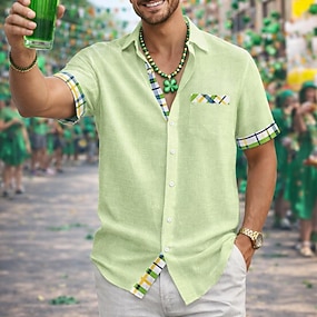 camicia da uomo, camicia di lino, camicia estiva per il giorno di San Patrizio, abbigliamento da spiaggia, camicia con bottoni, tinta unita, casual, spiaggia, manica corta, colletto, estate, primavera