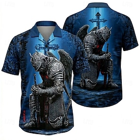 Per uomo Cavalieri Templari Crociati Croce Camicia Camicia con Bottoni Camicia con collo camp Manica Corta Vintage Retrò Ferie Casual Quotidiano Estate Primavera Colletto cubano Stampa 3D Blu