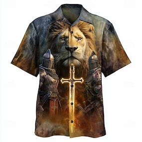 Per uomo Leone Cavalieri Templari Croce Camicia Camicia con Bottoni Camicia con collo camp Manica Corta Vintage Retrò Ferie Casual Quotidiano Estate Primavera Colletto cubano Stampa 3D Arancione