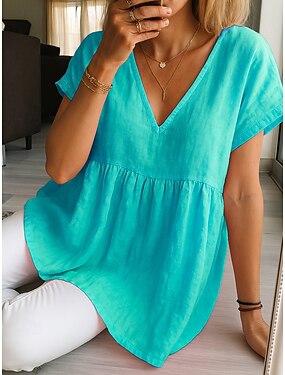 Top estivi da donna, casual, a maniche corte, con scollo a V, normali, verde chiaro, rosa, rosso, azzurro polvere, camicetta estiva, camicette in cotone e lino, semplici, basiche, moderne.