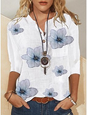 Per donna Camicia Blusa Camicia in finto lino Stampato Floreale Elegante Classico Moderno Manica Lunga Scollo a V Top Regolari Quotidiano Ferie Uscire Bianco Estate Primavera