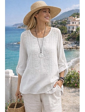 Per donna Blusa Finto cotone e lino Ricamato Floreale Elegante Casual Manica 3/4 Girocollo Top Regolari Quotidiano Blu Nero Rosa Verde Estate Primavera