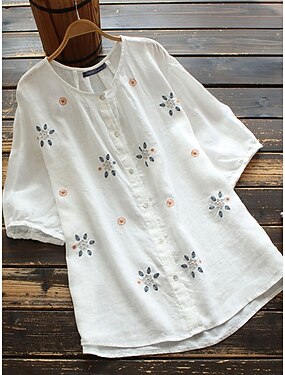 Per donna Camicie di cotone e lino Finto cotone e lino Ricamato Floreale Vintage Elegante Essenziale Mezza Manica Girocollo Top Regolari Quotidiano Bianco Arancione Estate Primavera Autunno
