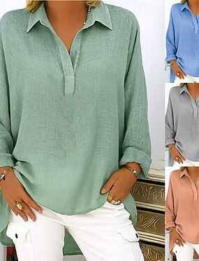 Camicie da donna in 100% cotone e lino effetto lino di colore solidale basic casual a maniche lunghe scollo a V regolare top quotidiani blu rosa verde grigio estate primavera autunno
