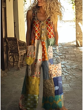 Tuta da Donna Attiva in Lino Come Grafica Floreale Senza Maniche Gamba Larga Collo Rotondo Patchwork Giornaliero Vacanza Fit Largo Blu Viola Estate