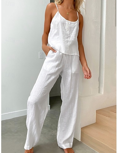 Per donna Set di Pantaloni Bolero Finto cotone e lino Senza Maniche Girocollo Tinta unica Moda Streetwear Casuale Quotidiano All'aperto Beige Estate Vestibilità regolare