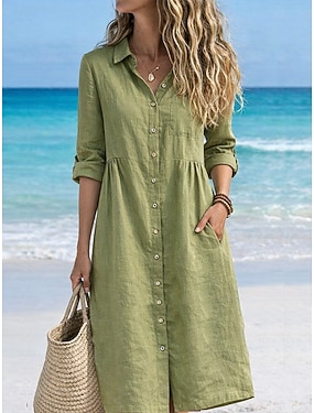 Per donna Abito Midi Finto cotone e lino Abito a trapezio Casual Quotidiano Vestibilità regolare Semplice Manica 3/4 Bavero Rosa Verde Estate Primavera Autunno