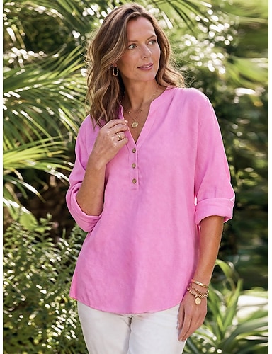 Per donna Blusa Finto cotone e lino Bottoni Tinta unica Elegante Casual Manica Lunga Scollo a V Top Regolari Quotidiano Blu Nero Bianco Rosa Primavera Autunno