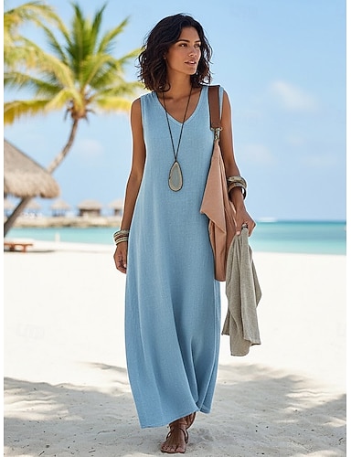 Abito maxi in lino donna in misto cotone abito estivo abito a trapezio vacanza casual all'aperto vestibilità regolare tinta unita senza maniche scollo a V blu estate primavera