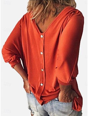 T-Shirt Donna Colore Unito Stile Casual Manica Lunga Collo a V Top Regolari Giornalieri Bottoni Blu Nero Bianco Vino Verde Militare Estate Primavera Autunno