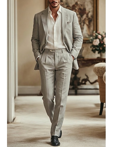 Uomo Completi in Lino Matrimonio in Spiaggia Casuale Beige Primavera, Autunno, Inverno, Estate Tuta Quotidiano Leggero Tinta unita Vestibilità standard 2 pezzi Monopetto a un bottone