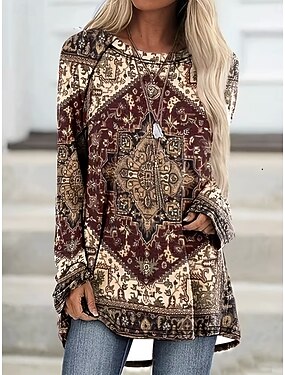 Per donna Maglietta Stampato Grafico Geometrico Tribale Vintage Elegante Classico Manica Lunga Girocollo Top Regolari Quotidiano Marrone Cachi Primavera Autunno