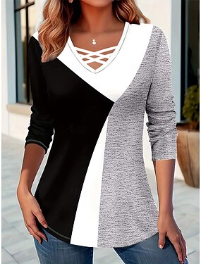 Per donna Maglietta Taglio Stampato Grafico Blocco di colori Geometria Vintage Elegante Classico Manica Lunga Scollo a V Top Regolari Quotidiano Bianco e nero Autunno Inverno