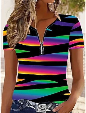 Per donna Maglietta Cerniera Blocco di colore Zip a un quarto Grafico Geometrico Tropicale Hawaiano Elegante Manica Corta Girocollo Top Regolari Quotidiano Sportivo Uscire Fucsia Estate Primavera